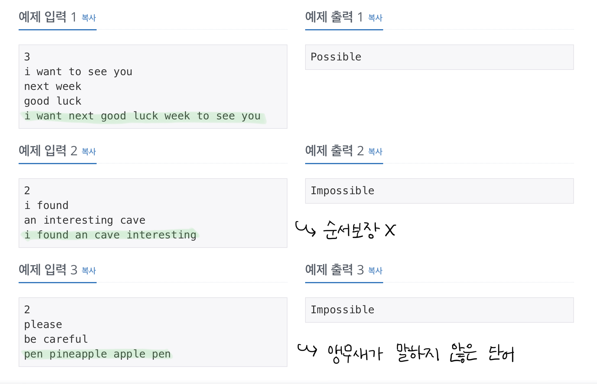 그리고 sentence가 모두 pop 되었으면 possible을 출력하고, sentence가 남아있다면 impossible을 출력하도록 했다.
