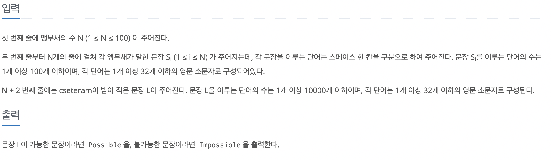 그리고 sentence가 모두 pop 되었으면 possible을 출력하고, sentence가 남아있다면 impossible을 출력하도록 했다.