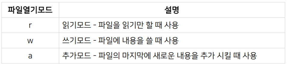 - 파이썬은 파일 처리를 위해 "open" 키워드를 사용함
