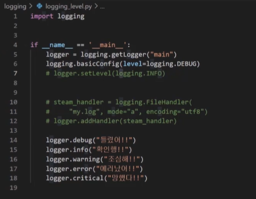 기존에는 .setLevel을 이용했으나 업데이트 이후 .basicConfig도 이용가능 하다고 한다.